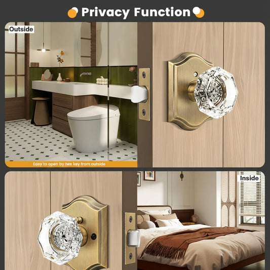 Probrico Diamond Crystal Glass Door Knobs Antique Brass Square Rosette Privacy/Passage Door Lock DLC30AOAB