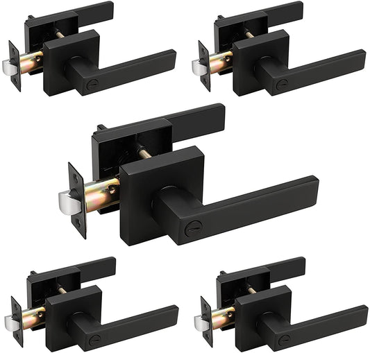 Probrico Heavy Duty Flat Black Square Privacy Interior Door Levers Bedroom and Bathroom Door Handles Keyless Bed/Bath Lockset (5 Pack)